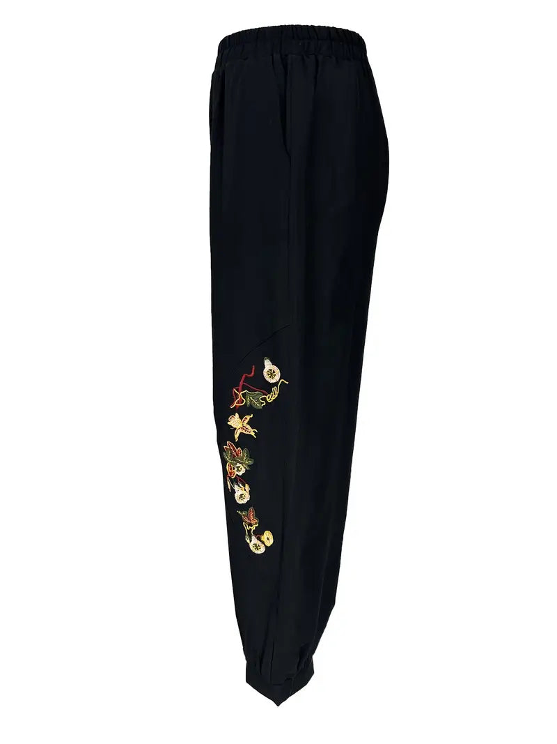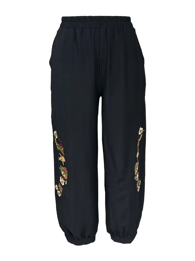 Questi pantaloni ricamati a taglio ampio sono realizzati in un tessuto traspirante e leggero che garantisce comfort per tutto il giorno. Con una vita elastica per una vestibilità flessibile, offrono libertà di movimento mantenendo una silhouette elegante e aderente.